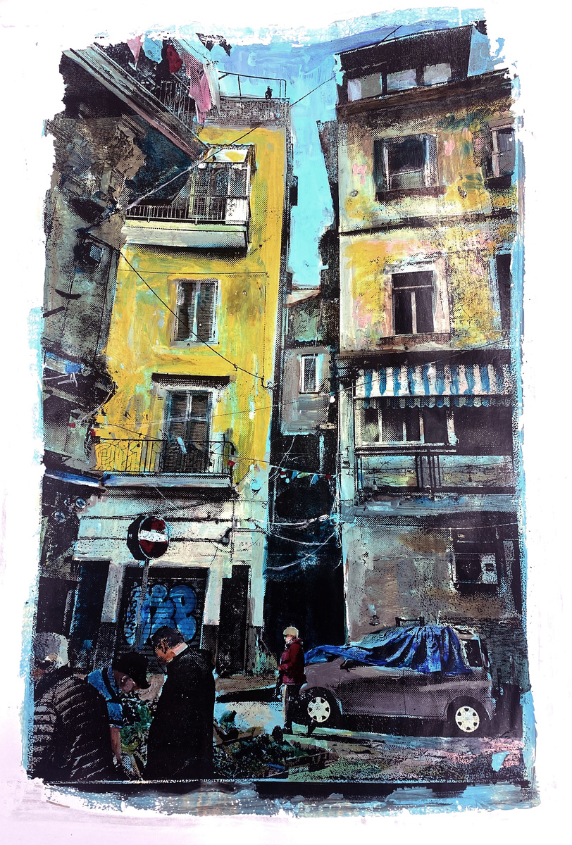 This is in the historic centre of Naples Italy. In Naples, the streets flow with life, energy and trash. You can see a car covered by a tarp and vegetable sellers in the foreground. It is sensory overload and incredibly fascinating. To celebrate this I created this monotype.