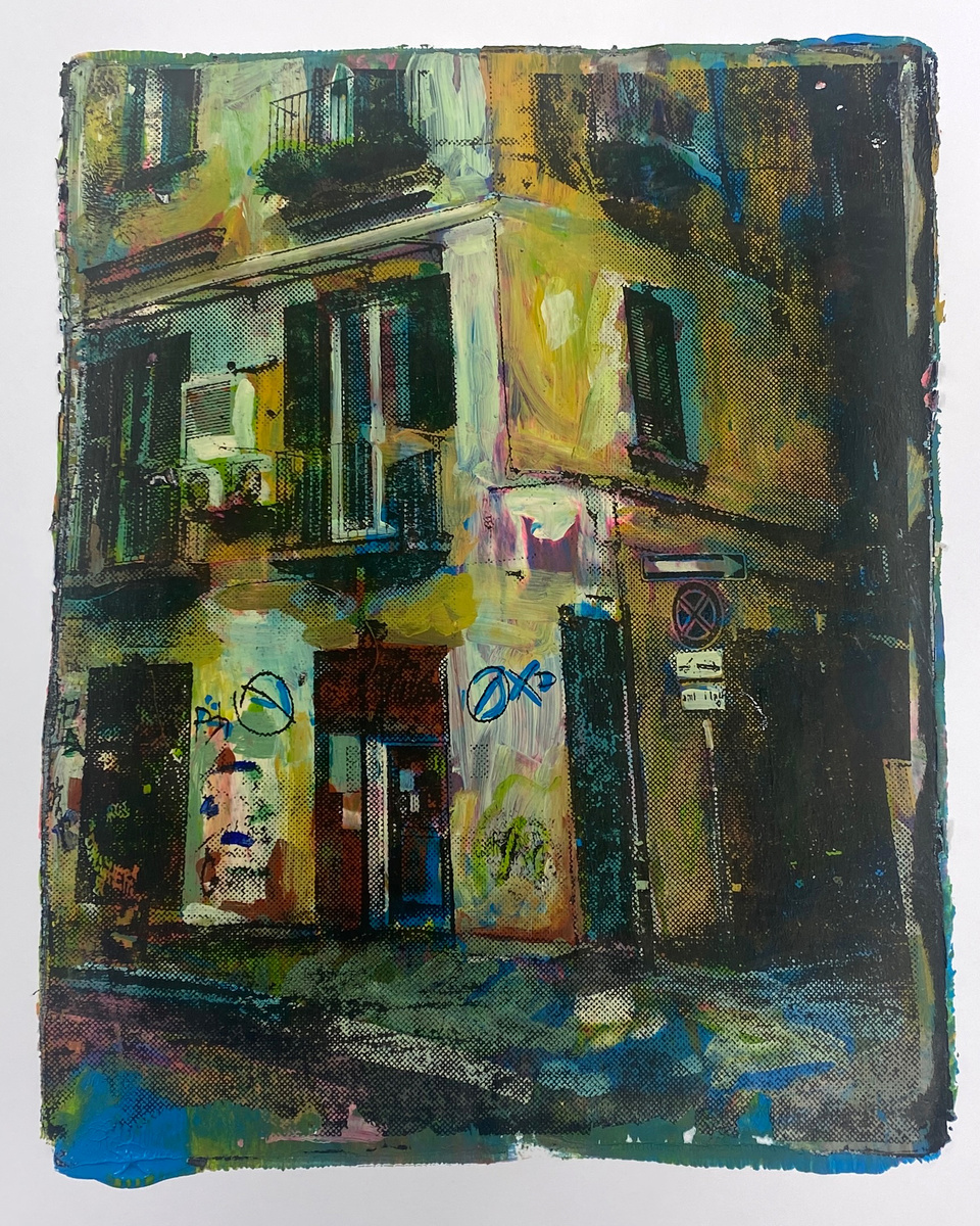 The piece is based on my photography in Naples, Italy. In the detail photos you can see the halftone that I created on the image and the several layers of acrylic paint underneath. The uneven edges and the monotype technique itself emphasize the singular, one-of-a-kind nature of each print. Painted with high quality acrylic paints. Check out my viral videos explaining the process on my social media accounts.
